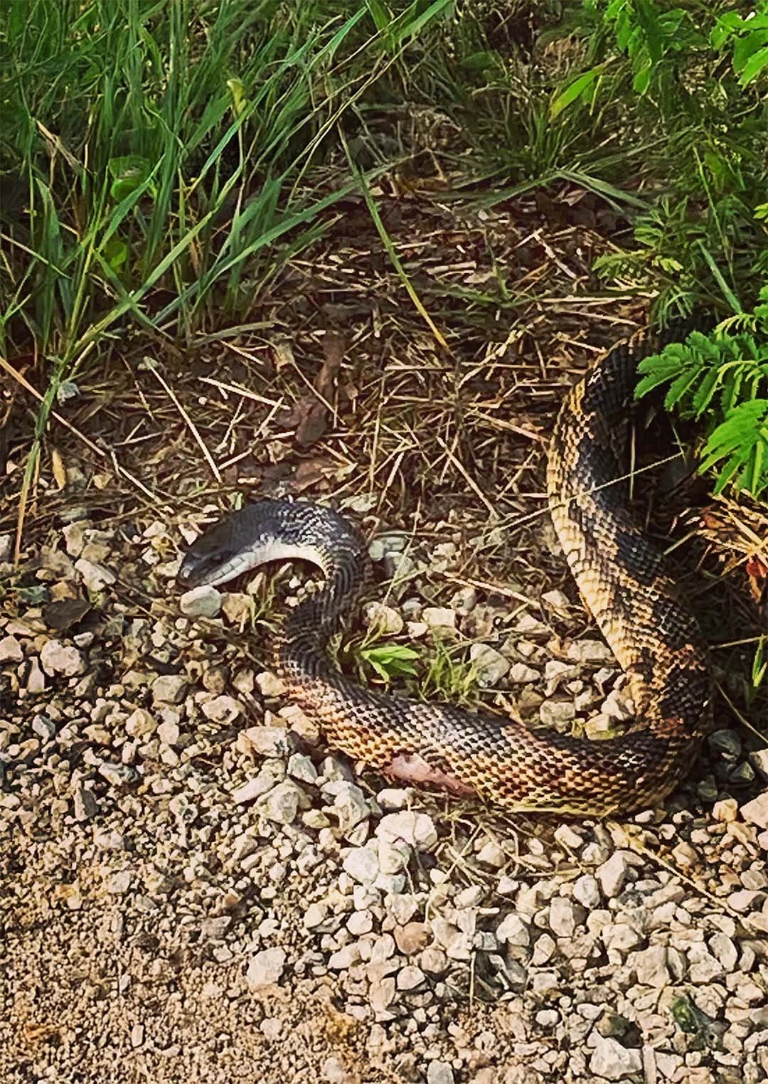 There was an old snake down the road;